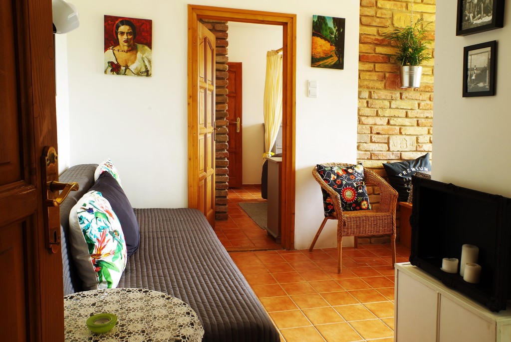 A két ágyat kérhetitek külön, vagy összetolva is. Ez utóbbi esetben még egy babaágy is elférhet. A szobából közvetlenül nyílik a bájos Türkiz fürdő, tusolóval, mosdóval, wc-vel.