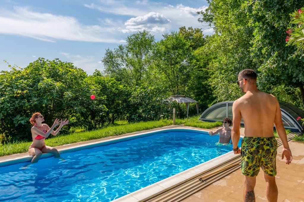 A lefedhető, és (hőszivattyúval) fűthető medencénk minden korosztály kedvence. Nyáron elviselhetővé teszi a kánikulát, leköti a gyerekeket, megmozgatja a felnőtteket, a mellette lévő nyugágyakból feltáruló látványtól meg szinte lehetetlen elszakadni. Az eltolható tetőt úgy terveztük, hogy kényelmesen lehessen alatta játszani, labdázni - eső, hűvösebb idő esetén. Itt könnyű a pihenésre koncentrálni!